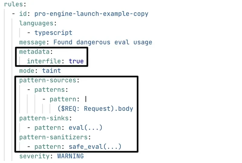 Pro Engine provides interprocedural analysis, including dataflow analysis methods such as taint analysis, constant propagation, and typed metavariables.