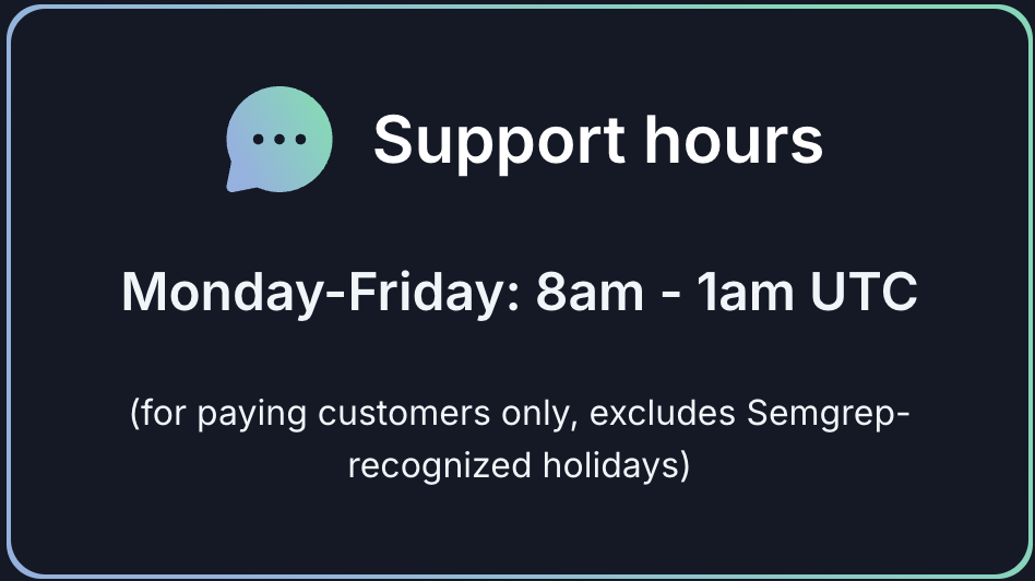 Unless otherwise specified by contract with Semgrep, standard support hours are available to paying customers and defined as 5 days a week from 8am - 1am UTC (Monday to Friday), excluding Semgrep-recognized holidays.