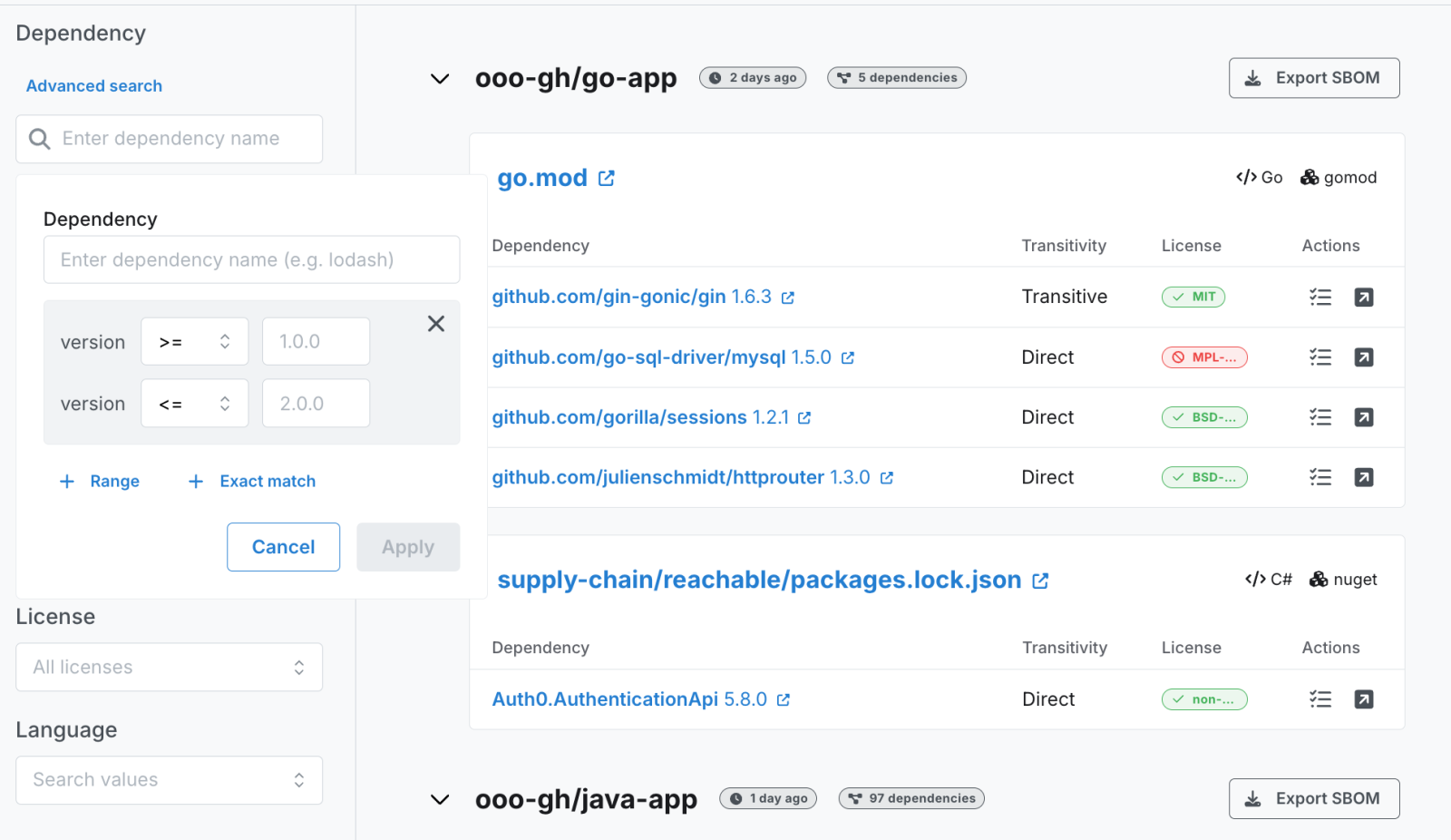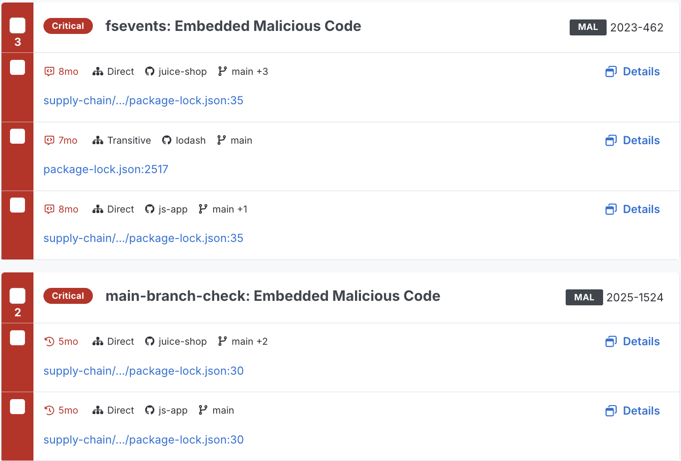 Instantly determine exposure by searching your environment for any single, or batch of malicious dependencies.